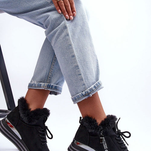 Women's sports shoes were made of eco-suede. The model is set on a platform with a mirrored element at the back. Zippered on the outer side of the upper and additionally laced. A soft insole will ensure comfortable use of the footwear. The top of the upper is decorated with fur. Inside, the shoes are insulated with a shoe blanket....