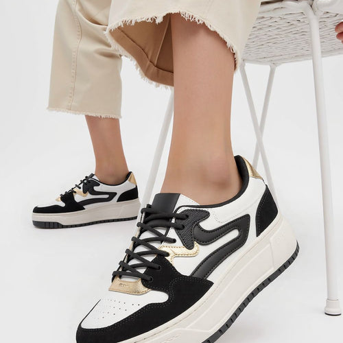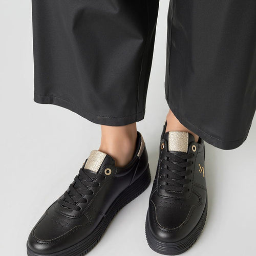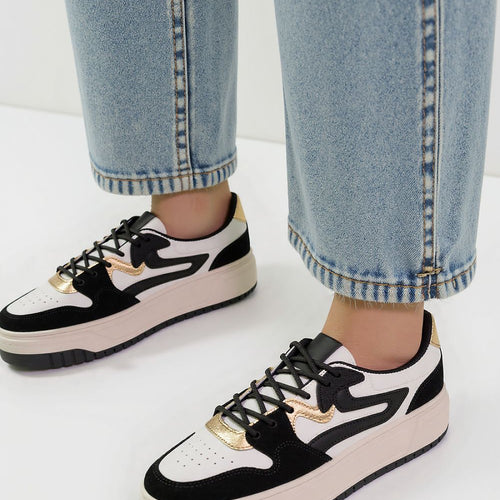 Stylish sneakers AVANA Black is a combination of classic black, gold details, and contrasting white, giving the shoes an elegant yet sporty look. These platform sneakers not only provide exceptional design but also everyday comfort. Material: Upper: Synthetic leather + suede Interior: Textile material Sole: Synthetic material fabric imitation leather + suede