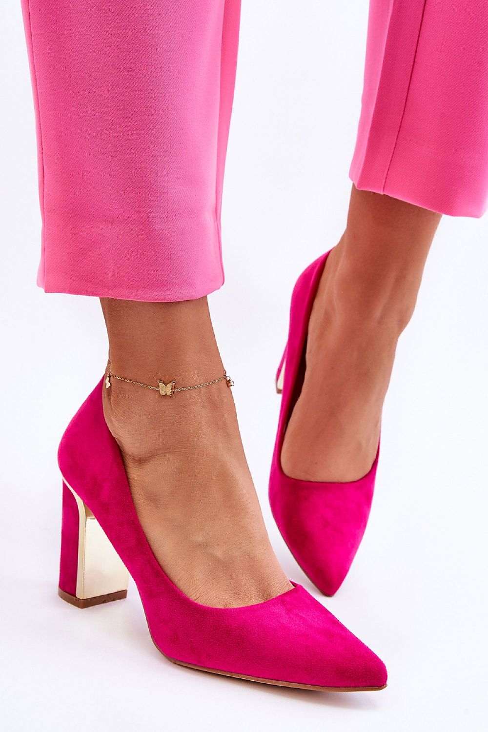 These wonderful pumps are set on a heel in the form of a stable post decorated with a mirror element. They were made of high-quality eco leather. The soft insole will ensure comfortable use. It was made of natural leather. Characteristic pointed nose. Ideal model for work, date or business meetings.