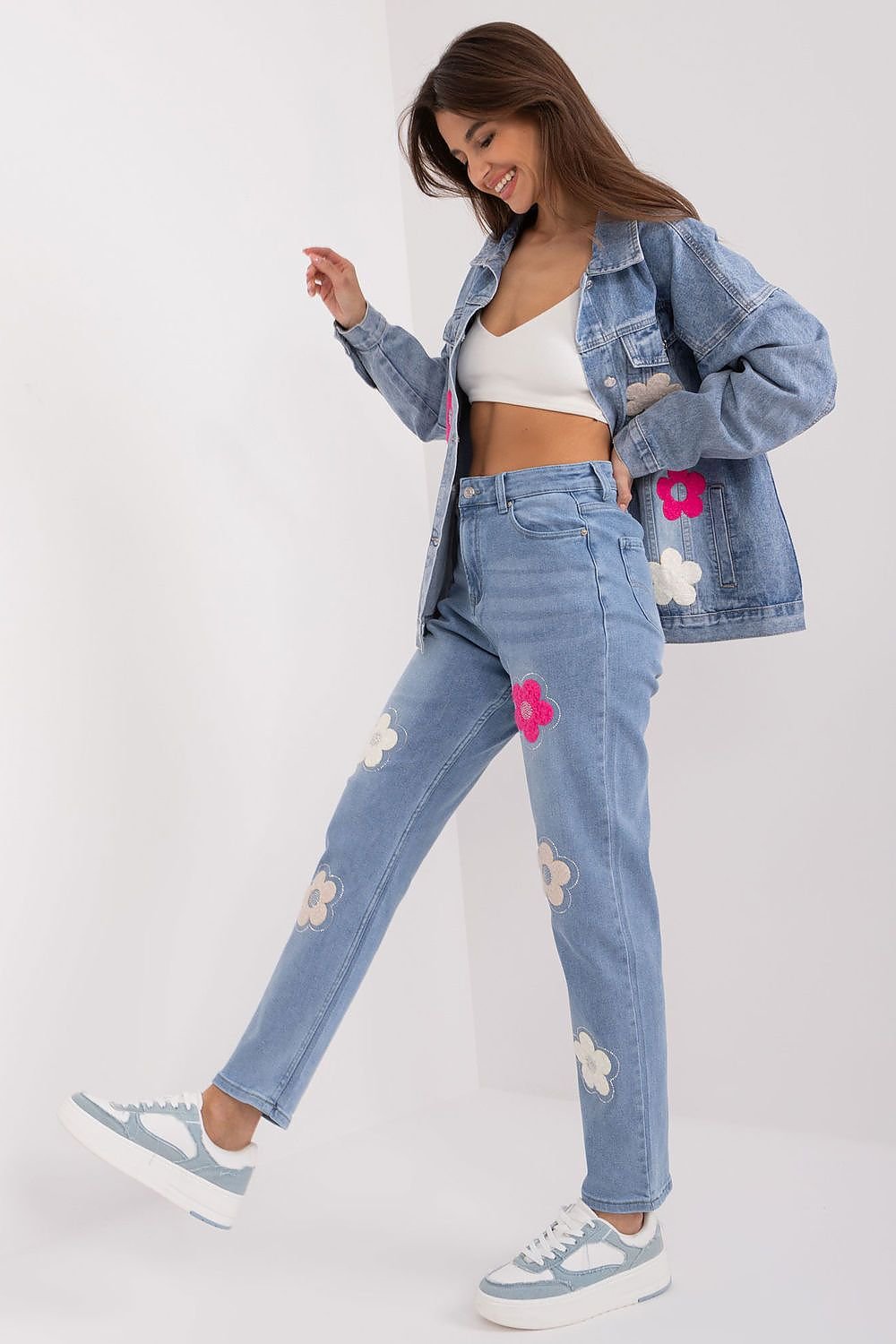 Women's straight leg jeans are an excellent choice for women who value comfort and timeless style. Their casual nature makes them perfect for everyday wear, being ideal for a variety of occasions. The distinctive floral pattern gives them lightness and feminine charm, making them the perfect choice for summer days. These jeans are made of high-quality cotton, which guarantees comfort and durability. The high rise further accentuates the silhouette, providing a confident and fashionable look. Straight legs make these jeans not only stylish, but also versatile, perfectly matching with different types of footwear. A zipper and button closure ensure easy and comfortable wearing, while slip pockets add practicality. An additional decorative element in the form of rhinestones around the floral pattern gives the jeans subtlety and uniqueness, attracting the eye. Women's straight leg jeans are an excellent choice for women who appreciate the combination of comfort, casual style and feminine elegance. They are perfect for everyday wear, creating striking and fashionable combinations.
