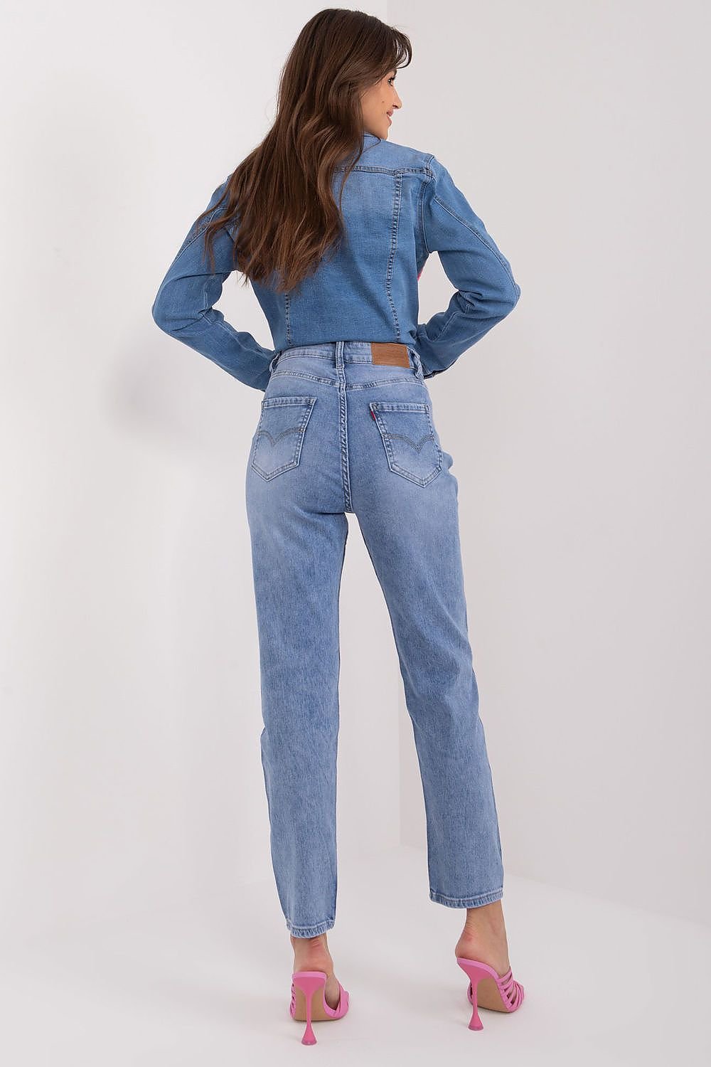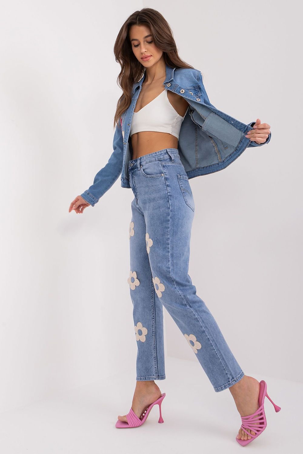 Traight leg denim pants are an excellent choice for women who appreciate comfort, casual style and unique details. Designed for everyday situations, they are a great option for those looking for practical and fashionable pants for various occasions. Their smooth cotton fabric provides comfort while remaining durable. The high rise of the pants adds to their elegance, emphasizing the natural curves of the figure. The legs of the straight leg pants taper, giving them a modern and sleek look, perfect for everyday wear. The most distinctive feature of these pants is the flower appliqués placed on the front of the legs. This subtle decoration adds a unique touch to the pants, combining the delicacy of the floral pattern with the rawness of denim. The zipper and button closure makes wearing the pants comfortable and practical. The slip pockets add functionality, allowing you to store small items. These jeans are not only an expression of personal style, but also a perfect combination of fashion, comfort and originality that will make you stand out every day.