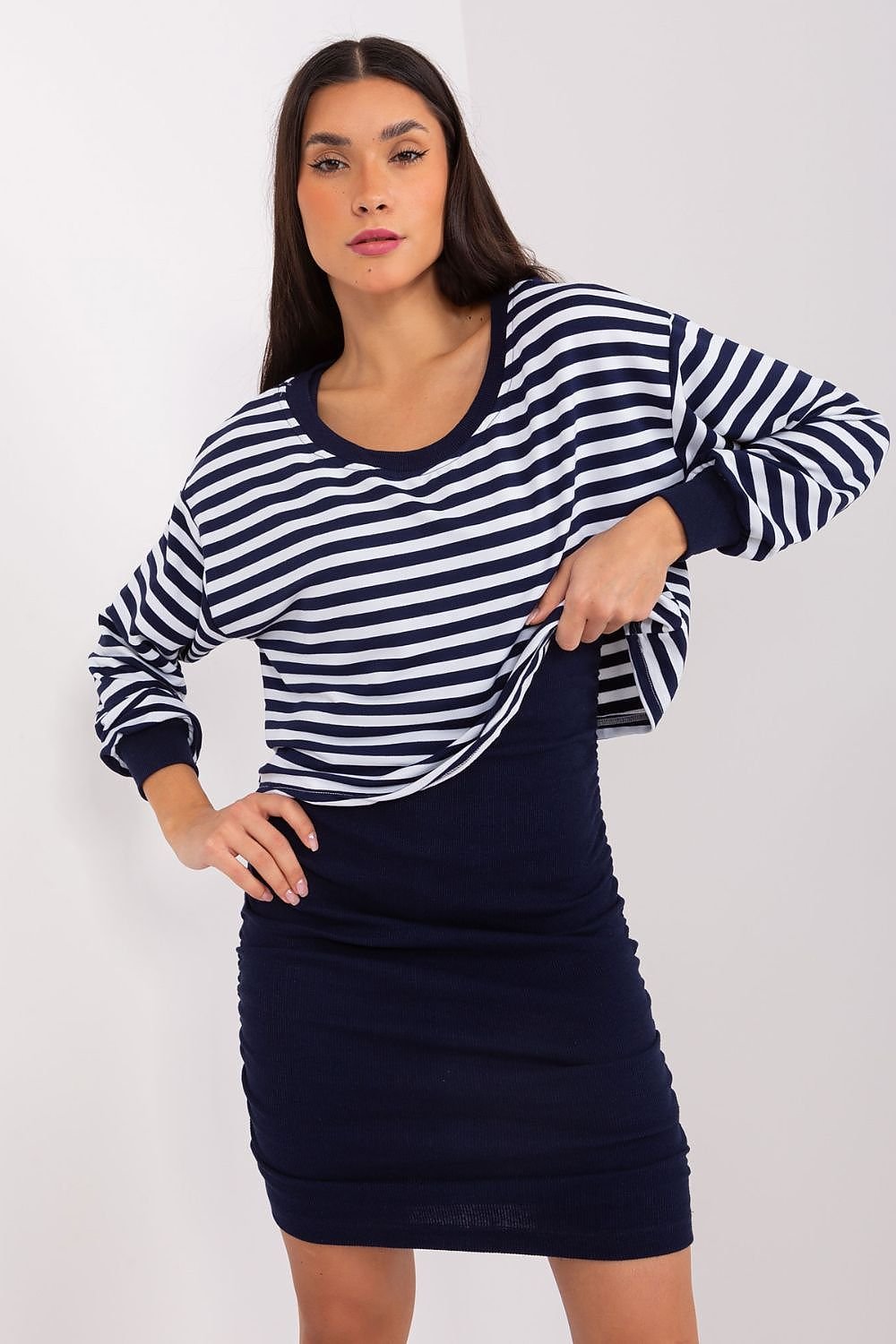 The blouse and dress set is a perfect combination of lightness and style, ideal for everyday situations where you want to feel comfortable while looking graceful. The strapless dress made of ribbed material adds originality to the set, maintaining a casual character. The striped blouse is a distinctive element of the set, giving it a lightweight and pleasant, everyday character. Made mainly of cotton, it provides excellent wearing comfort, while remaining durable and skin-friendly. The strapless dress, kept in a mini style, features a round neckline and pleats on the sides, giving it a lightweight feel and adding dynamic movement. The ribbed material makes the dress look striking and eye-catching. The long-sleeved blouse is a practical solution that allows you to wear the set in different weather conditions. The creases on the sides of the dress add subtle details, while emphasizing the silhouette. This set perfectly combines the comfort of a striped blouse with the originality of a strapless dress made of ribbed material. The casual style makes it the perfect outfit for everyday outings, shopping or meetings with friends, while keeping it light and free to move.