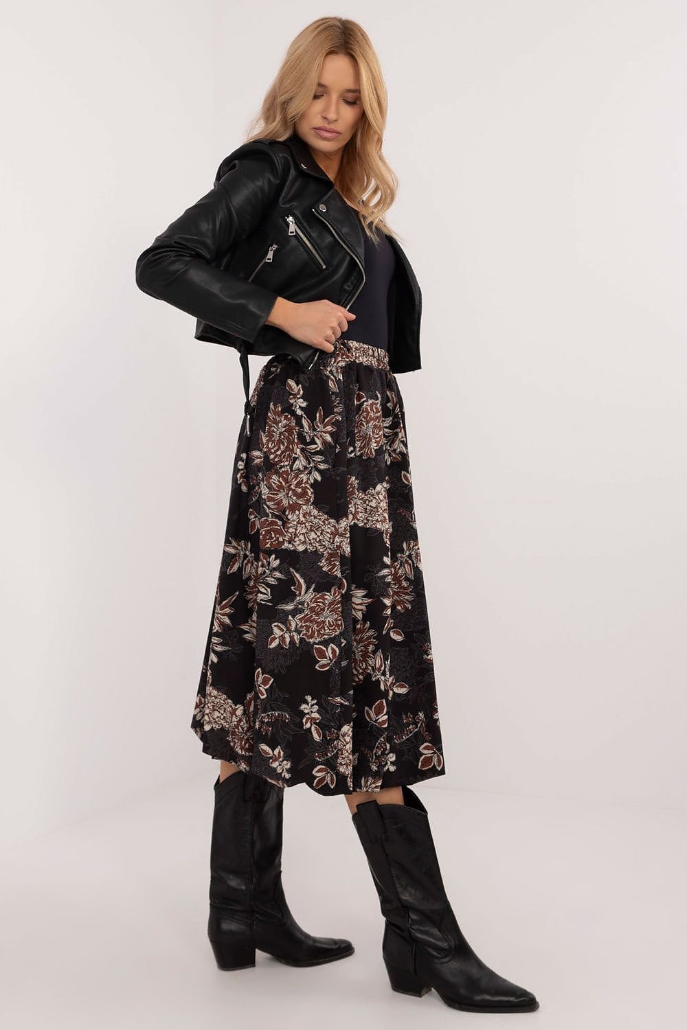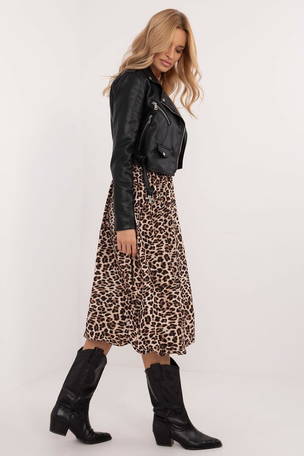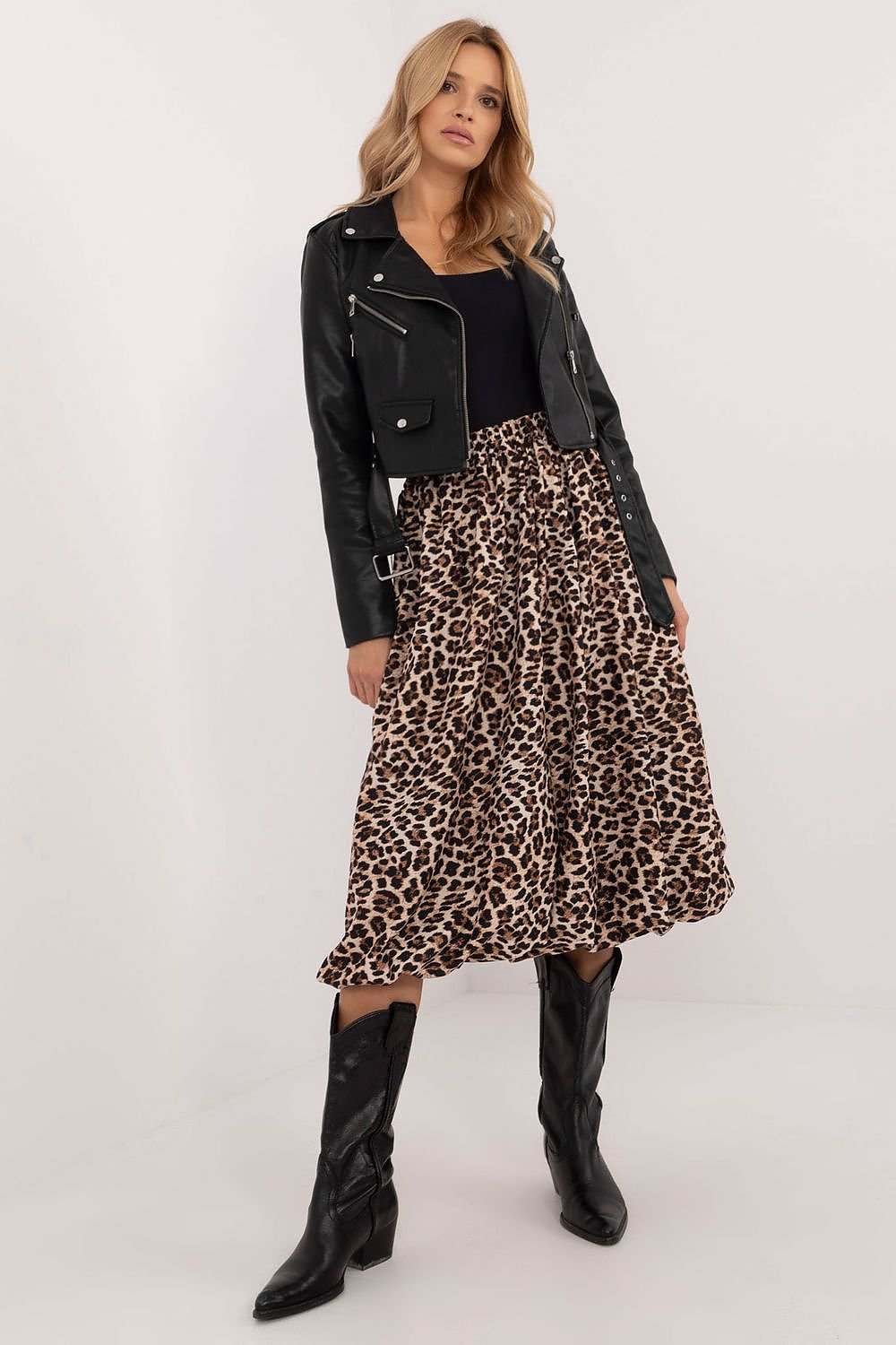 A bomber skirt with an elegant character, ideal both for everyday wear and for work or formal occasions. It is made of polyester, with a viscose lining, which ensures comfortable wear and breathability. There is an elastic waistband, which guarantees a comfortable fit, and practical pockets hidden in the side seams add functionality. The midi length skirt, with a leopard print, combines elegance with lightness and feminine style. The lack of a clasp emphasizes its minimalist design, ideal for various occasions.