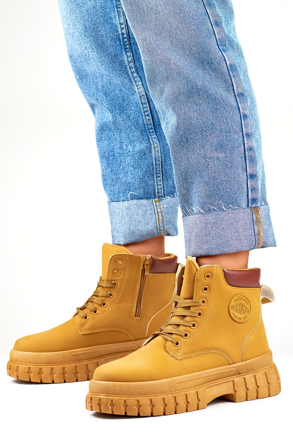 Our Camel trappers are a combination of style and functionality. Made of durable eco leather, they not only provide a fashionable look, but also protection from cold and moisture. The upper's height of 11 cm guarantees support for the ankle, while adding elegance. The inside of the shoe is lined with a soft textile insole, which ensures all-day comfort. Textile warming, on the other hand, makes the trappers suitable for wearing on colder days. The 5 cm high heel adds a subtle lift to the shoes, while keeping the step stable. The zippered plus lacing closure makes it easy to put on and take off the boots, while ensuring a perfect fit. The round toe gives the trappers a versatile feel, making them a great addition to many outfits. More than just footwear, our Camel trappers are an expression of personal style and elegance with every step.