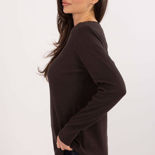 Elegant, thin longsleeve blouse with a fitted cut, perfect for everyday stylizations, especially when comfort and subtle elegance matter. Made of high-quality blend of viscose, elastane, cashmere, and nylon, it is exceptionally soft, pleasant to the touch, and elastic, which makes it fit perfectly on the silhouette. The smooth pattern model has a standard length and long sleeves, making it...
