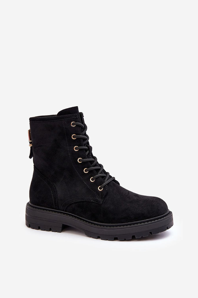 Classic women's ankle boots made of faux suede. Set on a platform and flat heel. This model is fastened with a zipper and additionally has lacing. Rounded toes. The stiffened heel will allow for proper foot stabilization. At the back of the shaft, there is a short strap with a buckle. You must have them! fabric imitation leather suede warmers...