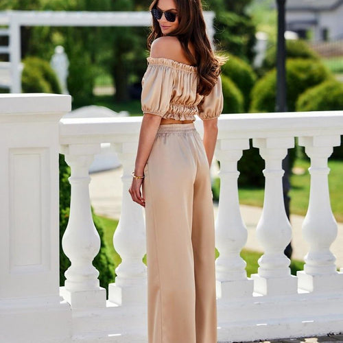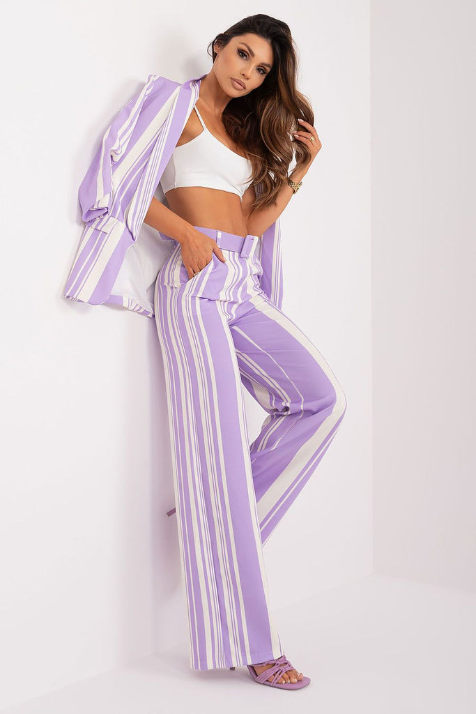 Elegant women's fabric pants, distinguished by flared legs at the bottom, which add lightness to the silhouette and elongate the legs. The pressed edge emphasizes their classic and sophisticated character, ideal for both work and formal occasions. The pants have a high rise that beautifully accentuates the waist, while the covered zipper at the back provides a smooth, discreet closure....