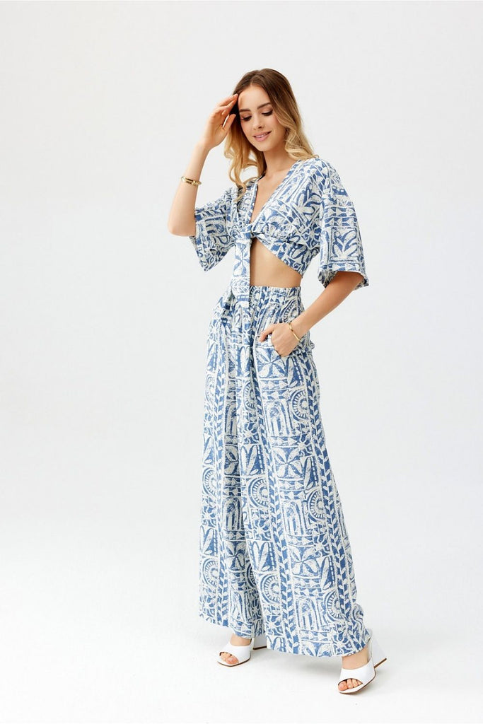 Capri pants are a high waist high waist model with wide leg flared legs. The pants have an elastic waistband and open pockets on the sides. They are made of pleasant and airy patterned fabric, which will also be perfect for hot days. The cut of the Capri pants will look great on all figures. Above all, the pants will...