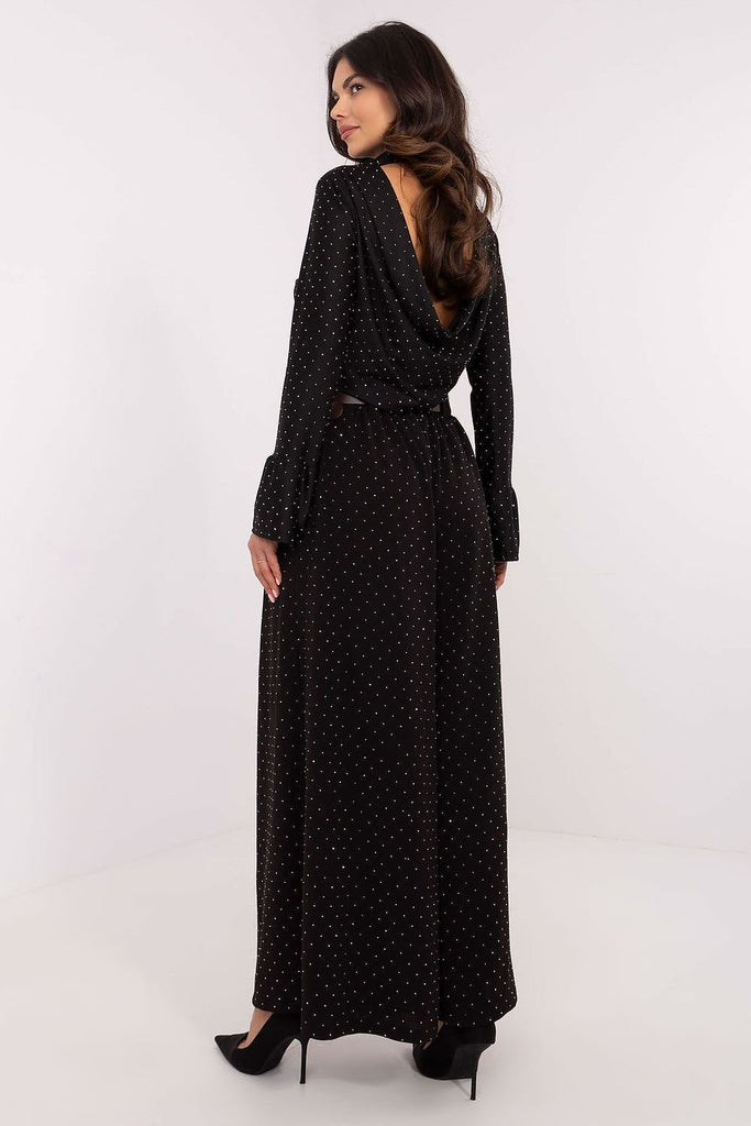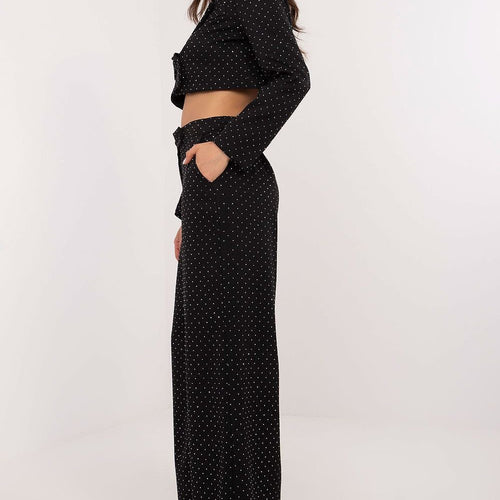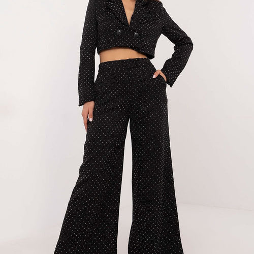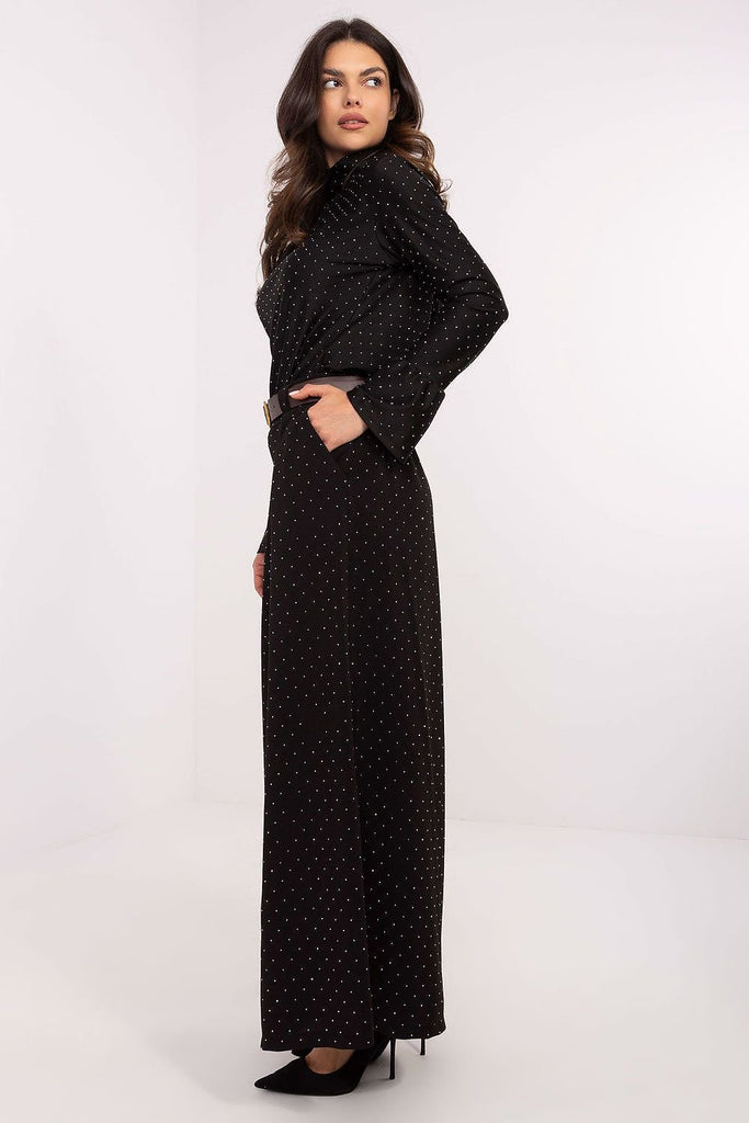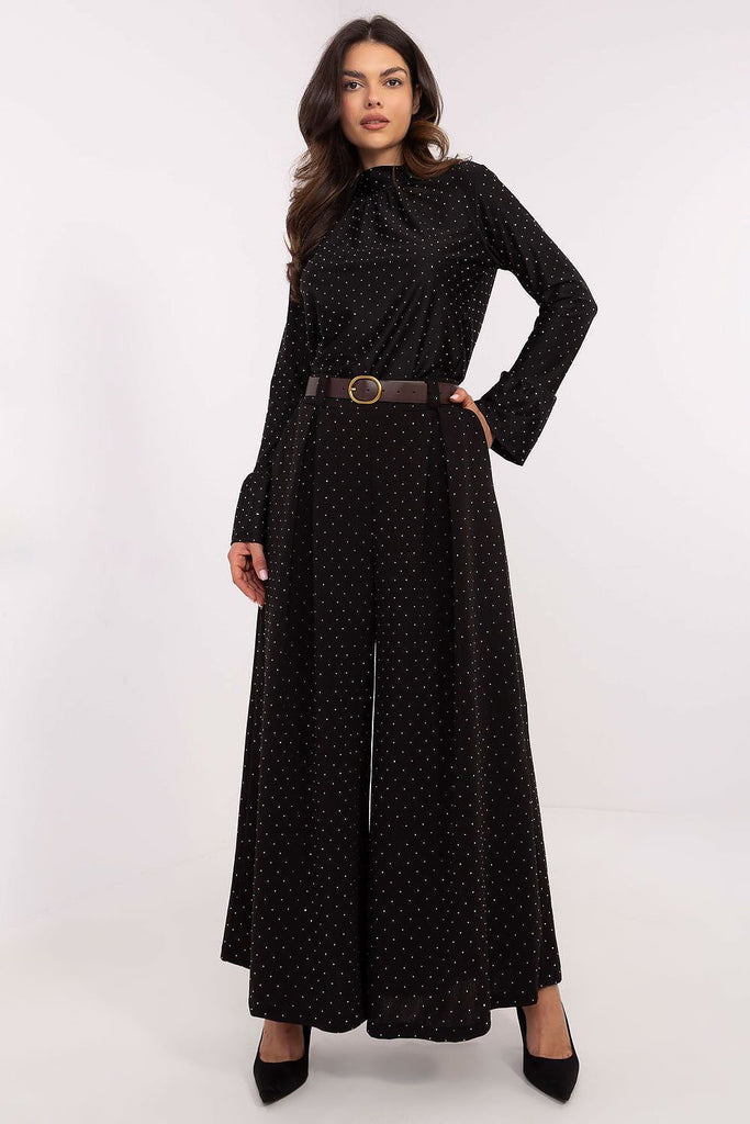 Elegant palazzo pants, which are the perfect choice for formal occasions and events. Made of polyester with a touch of elastane, they provide comfort, durability, and excellent fit to the silhouette. Their wide legs and high waist accentuate the figure, giving the outfit a sophisticated look. The entire fabric surface is adorned with shiny sequins, adding a luxurious character to...