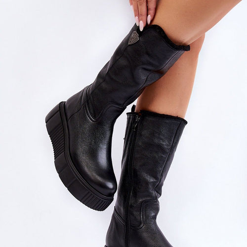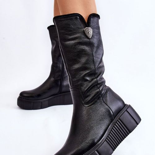 Women's boots were made of natural leather. This model features a zipper on the side of the upper. The interior has been insulated with natural wool. The heel counter is stiffened. The boots are set on a massive platform and an anchor. They have a decorative element on the side of the upper. This model will be perfect for cold...