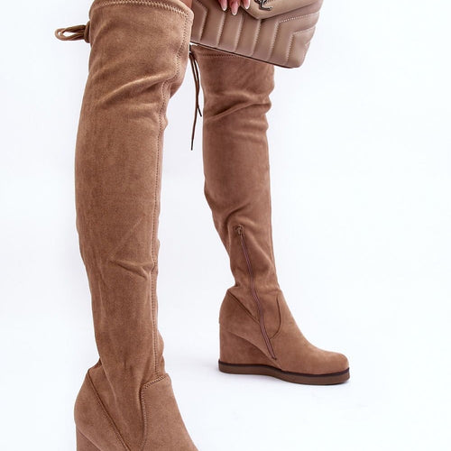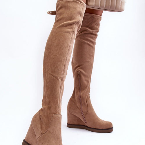 Women's boots with a tied upper behind the knee. Slip-on model, with an additional zipper on the side of the upper. Set on an anchor and a platform. Warming at the height of the foot. The heel counter is stiffened. This unique cut will delight everyone! fabric imitation leather suede Footbed fur Upper height 54 cm Heel height 9.5 cm...