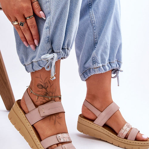 Classic women's sandals were made of eco leather. This model was set on an anchor and a platform. The soft insole made of natural suede additionally has perforation. A great model for hot days. The sandals have a Velcro fastening. This model should be yours! fabric artificial leather Footbed ~skóra naturalna zamszowa Heel height 5 cm Platform height 3 cm...