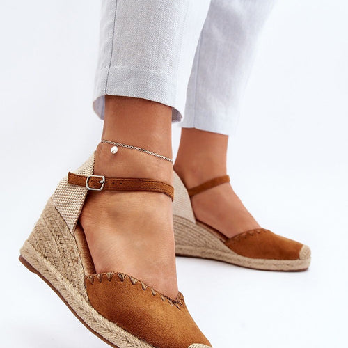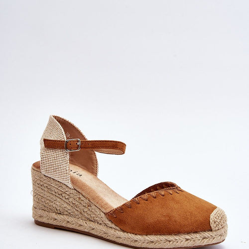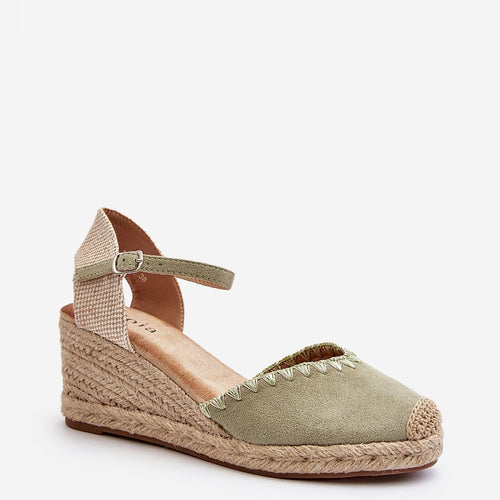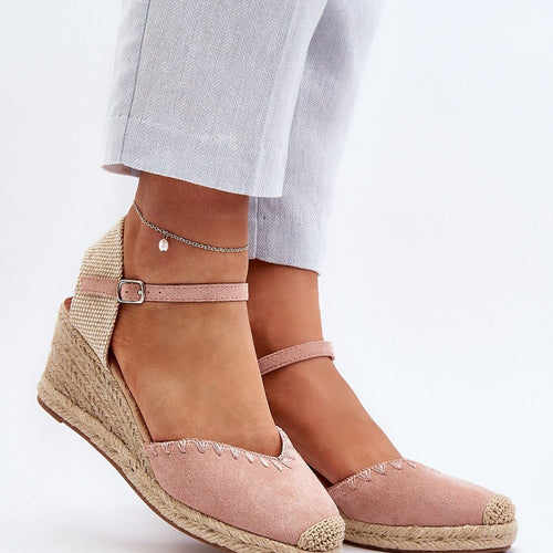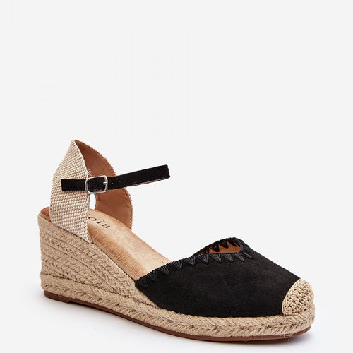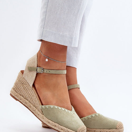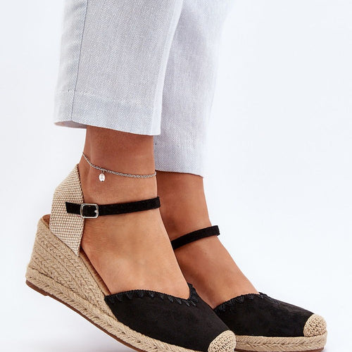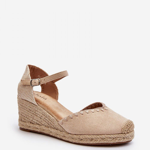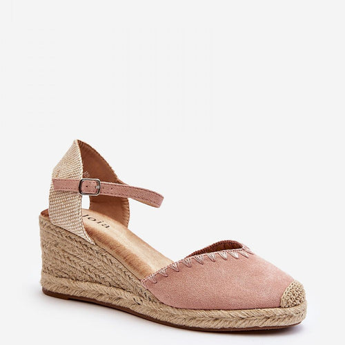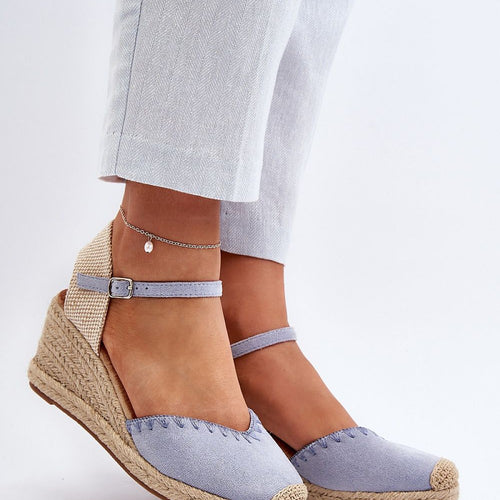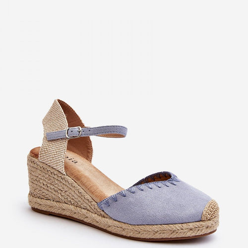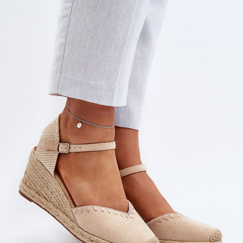 Women's sandals in the style of espadrilles. Made from a combination of eco-suede and fabric. Their adjustable strap fastened with a buckle around the ankle ensures a perfect fit. Set on an anchor and platform decorated with jute braid, which adds subtle charm and summer character. The soft eco-suede insole guarantees comfort and convenience while wearing. This model is an...