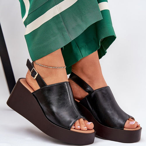 Stylish sandals made of eco leather, set on a tapered wedge, combining elegance with a modern look. Fastened with a buckle with an adjustable strap, allowing for a perfect fit to the foot. These fashionable sandals will be a perfect choice for warm days, pairing well with both dresses and pants. fabric artificial leather Footbed artificial leather Heel height 9...
