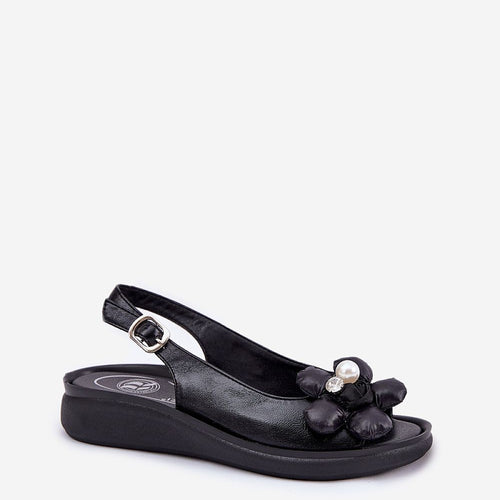 Women's sandals by Jezzi brand. Made of high-quality eco leather. Set on a delicate wedge, they provide stability and comfort when worn. This model is distinguished by a material, decorative flower that adds a unique charm. Fastened with an adjustable buckle strap, they guarantee a perfect fit to the foot. This elegant style will perfectly complement many outfits with dresses...