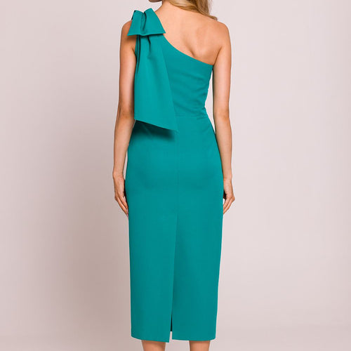 Elegant midi dress with a pencil silhouette, emphasizing the feminine figure. The model amazes with an asymmetrical cut with a motif on one shoulder, decorated with a fancy bow that adds elegance and a unique character. A high slit at the back subtly exposes the leg, giving the outfit lightness and sensuality. The dress is fastened on the side with...