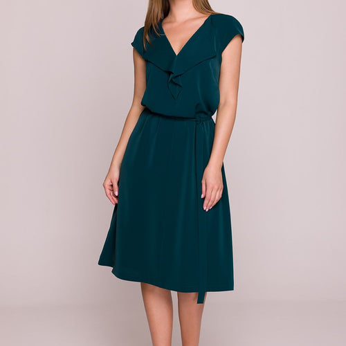 An elegant dress with a slightly flared A-line silhouette, reaching midi length, just to or slightly below the knees. Made of smooth fabric with a subtle shine that gives it a unique glow. The V-neckline is adorned with a decorative ruffle that emphasizes femininity and adds lightness. The short, draping sleeve complements the look perfectly, providing comfort when worn. The...