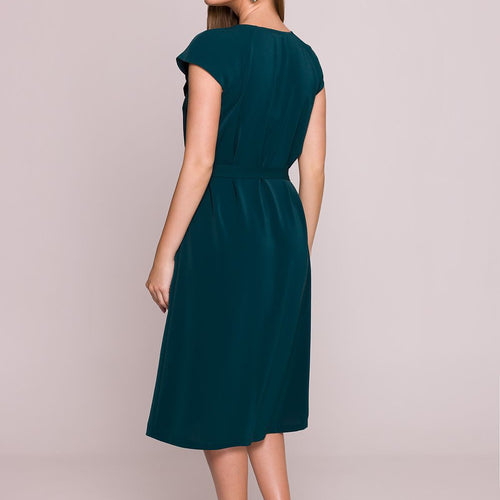 Discover the unique elegance and feminine cut in this midi dress, designed and sewn with attention to detail in Poland. It is the perfect choice for special occasions, combining classic with modernity. The dress is made of smooth fabric with a subtle sheen, which beautifully drapes on the silhouette and catches the eye. The deep V-neckline with a classic collar...