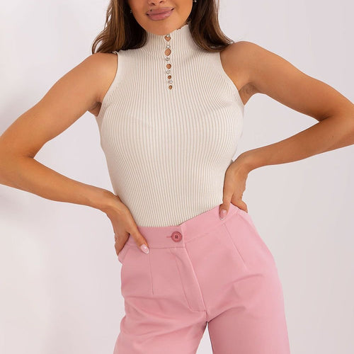 Sleeveless and turtleneck blouse made of ribbed fabric. On the front there are cracks and decorative zircons. Polyester 100 % Size Total length Chest one-size-fits-all 57 cm 84 cm
