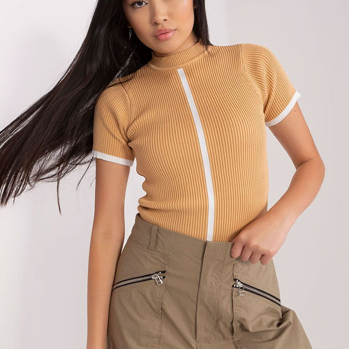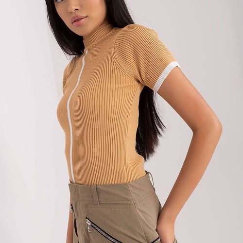 Blouse of ribbed fabric with short sleeves and a half turtleneck. A proposal ideal for everyday wear. The material is very stretchy. Polyester 100 % Size Total length Chest one-size-fits-all 57 cm 52 cm