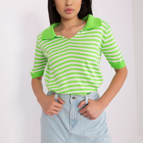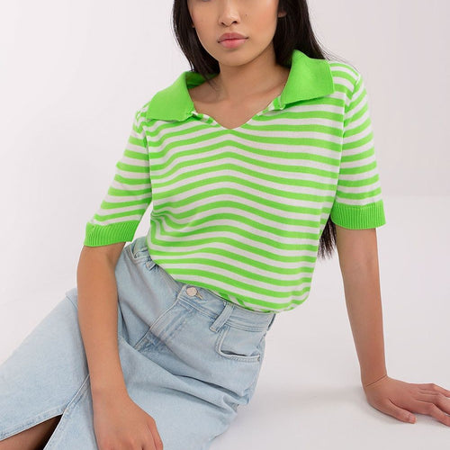 Striped knitted blouse with short sleeves and a collar. Acrylic 70 % wool 30 % Size Total length Chest one-size-fits-all 58 cm 90 cm