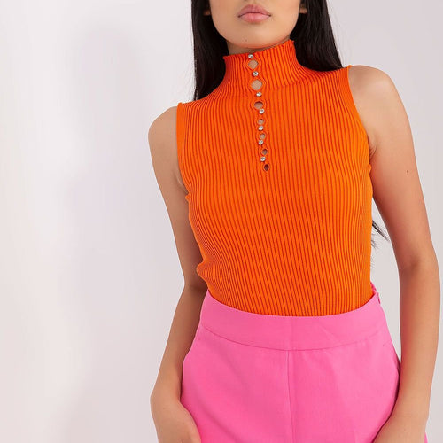 Sleeveless and turtleneck blouse made of ribbed fabric. On the front there are cracks and decorative zircons. Polyester 100 % Size Total length Chest one-size-fits-all 57 cm 84 cm