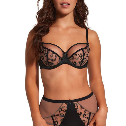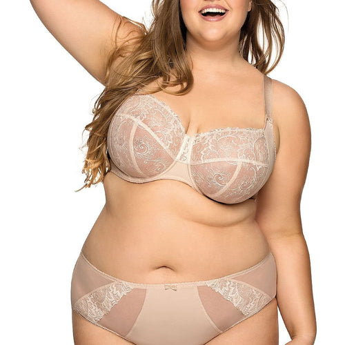 Sensual soft bra, dedicated to women with fuller shapes. Beige embroidery with a sophisticated pattern, emphasizes elegance. Double reinforced side part provides exceptional stability and gathers the bust inward. The lower part of the cup lined with soft stable mesh adds lightness to the lingerie. Movable side whalebones guarantee the fit to the body movement and increase the comfort of...