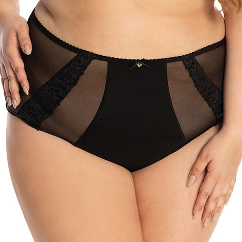 Very feminine full briefs with a slightly raised waist. Made of extremely delicate mesh, decorated with beautiful embroidery on the front. Slightly transparent. Legs finished with a broken band, sewn with flat seam technology. Cotton 5 % Spandex 14 % polyamide 56 % Polyester 25 % Size Hips width L 100-104 cm M 96-100 cm S 92-96 cm XL 104-108...