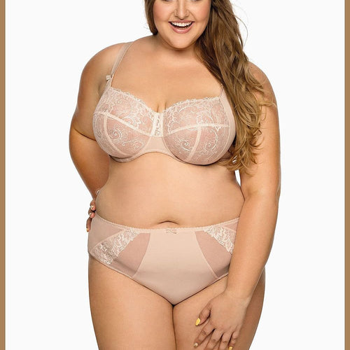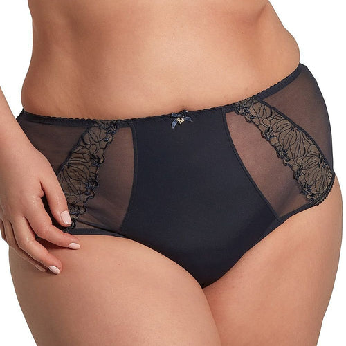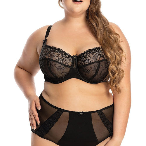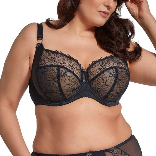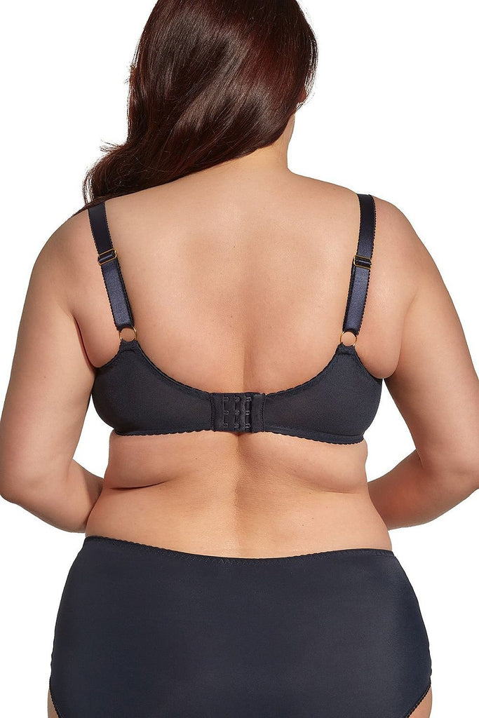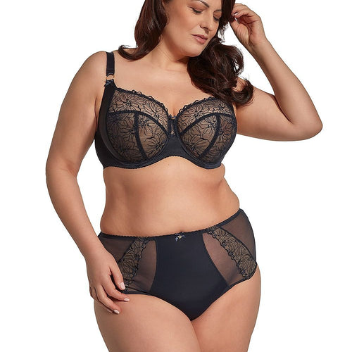 A sensual soft bra, dedicated to women with fuller shapes. Dark navy blue embroidery with a sophisticated pattern, emphasizes elegance. Double reinforced side part provides exceptional stability and gathers the bust to the center. The lower part of the cup lined with soft stable mesh adds lightness to the lingerie. Movable side whalebones guarantee the fit to the body movement...