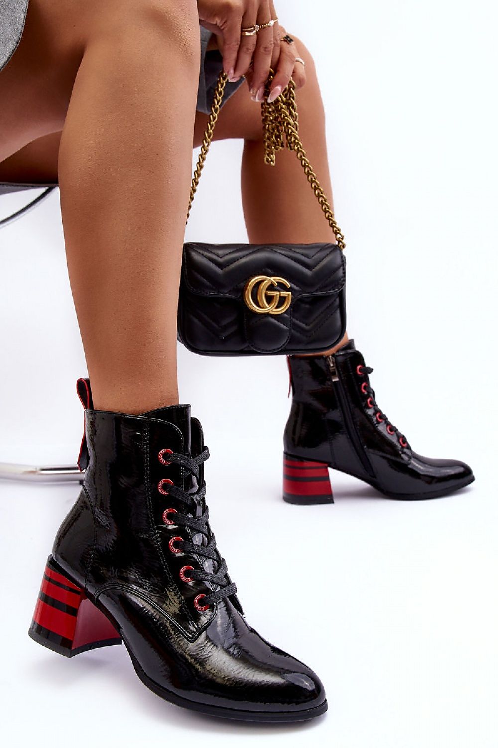 Women's boots made of eco leather. Zippered on the side of the upper and additionally have lacing. Heel decorated with stripes. Almond-shaped toe. Soft insole will provide comfort during use. The middle is insulated with a shoe blanket. In addition, the heel counter is stiffened.