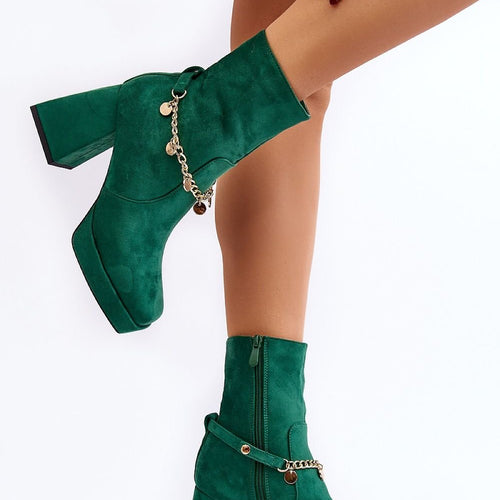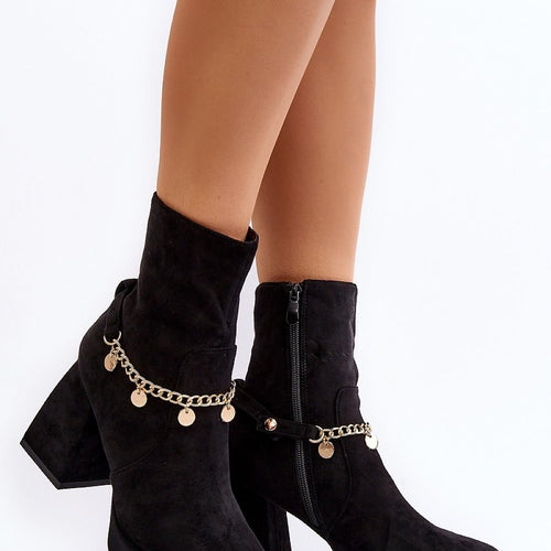 The women's boots are made of eco-suede, which gives them an elegant look. They are characterized by a sturdy block heel and square-shaped toes, adding a touch of modernity. The stiffened heel counter provides stability and comfort during use. The upper is decorated with a chain. These boots will be a perfect addition to autumn styling! fabric imitation leather suede...
