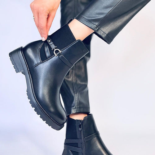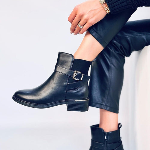 Women's veneer boots - slingbacks with a buckle. They are sure to captivate lovers of classic cuts in a matching all-black color. The boots have a rubber insert on the side of the upper and a zipper closure for easy putting on. They are made of organic leather, and the interior is lined with soft fur. fabric artificial leather warmers...