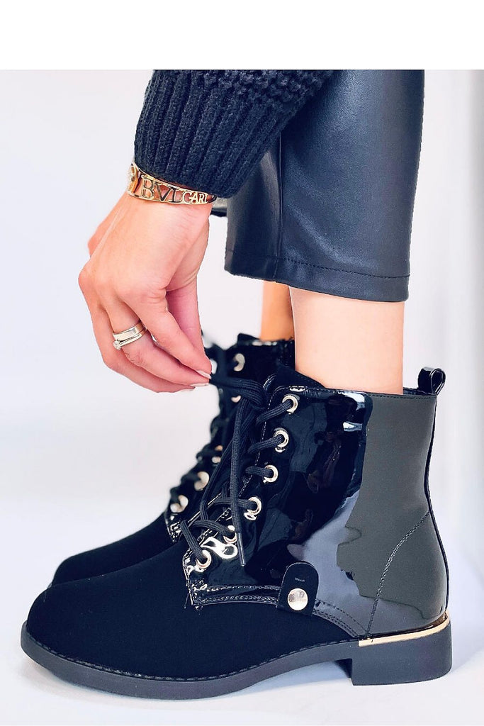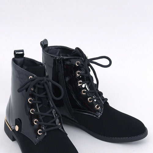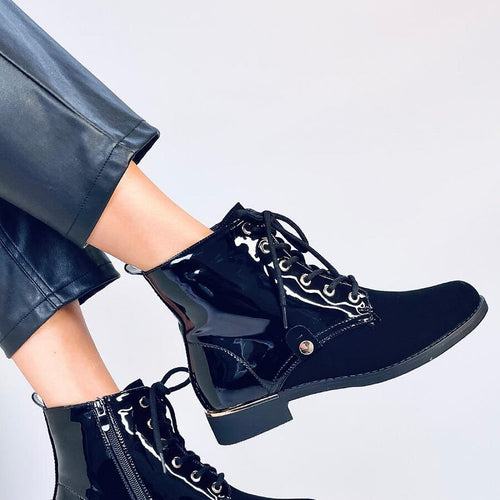 Women's lace-up boots - boots on a flat sole. They have a neat cut with striking lacquered inserts. They are traditionally laced, but additionally have a zipper on the side of the upper for easy putting on. The interior of the shoes is lined with soft fur. Outer material - ecological leather + ecological nubuck. fabric ~skóra ekologiczna + nubuk...