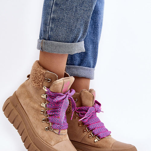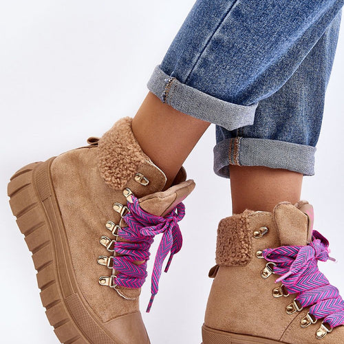 Women's trappers were made of eco-suede. Set on a massive platform made of rubber material. The interior was insulated with shoe blanket, which provides comfort and warmth during colder days. The toecaps are rounded, which adds a subtle charm to the shoes. The model is classically laced. Fashionable footwear makes a great addition to your closet! fabric imitation leather suede...