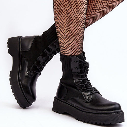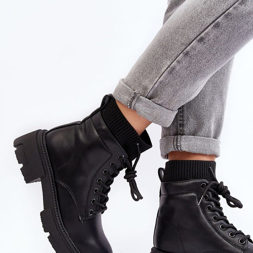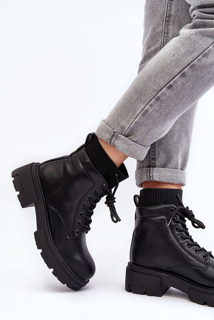 Women's boots made of a combination of eco leather and textile material. Ankle-length upper. Lace-up model. Set on a flat heel and a massive platform. Rounded toe. Stiffened heel counter. A classic model that will fit into many autumn stylings! fabric ~skóra ekologiczna plus tkanina Footbed ~tworzywo sztuczne Upper height 17 cm Heel height 5 cm Platform height 3 cm...