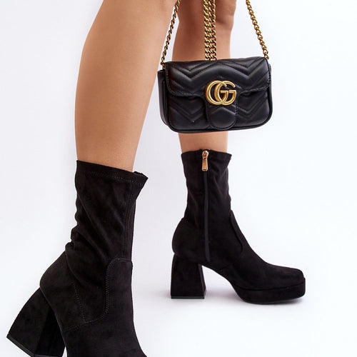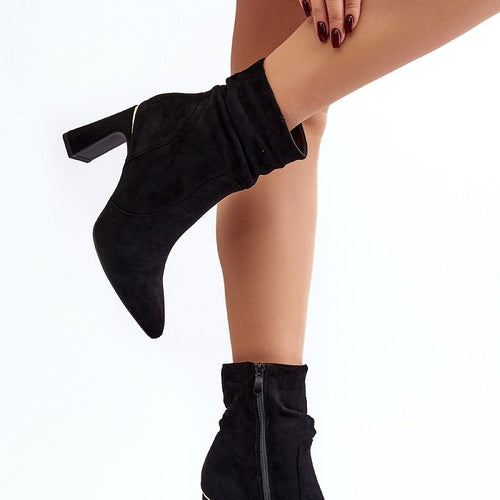 Women's boots made of eco-suede. Set on a heel in the form of a post with a mirror element. Pointed nose will optically slenderize the legs. Zippered at the side. Crinkled upper for the ankle. You should definitely have them! fabric imitation leather suede Footbed fabric Upper height 14 cm Heel height 9 cm Size Insole lenght 36 23.5 cm...
