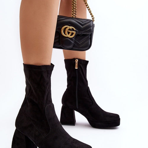 Women's boots made of eco-suede. Set on a massive block heel and a platform. Square toe. Stiffened heel counter. Ankle-length upper fastened with a zipper. Eco leather insole will provide comfort during use. Perfect for autumn styling! fabric imitation leather suede Footbed artificial leather Upper height 14 cm Heel height 8 cm Size Insole lenght 36 23.5 cm 37 24.5...