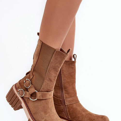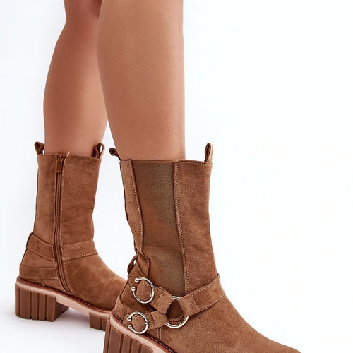 Exceptional women's boots with a higher upper made of eco-suede. They were decorated with straps with buckles on the side. Fastened with a zipper. Set on a massive flat heel and a platform with grooves on the sides. These boots have warming inside in the form of a nice-to-touch, soft fur. A great model for many stylings! fabric imitation leather...