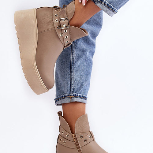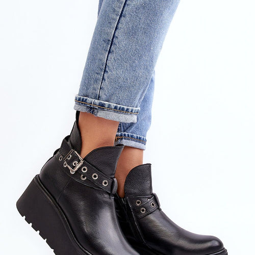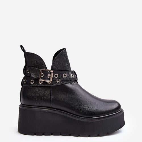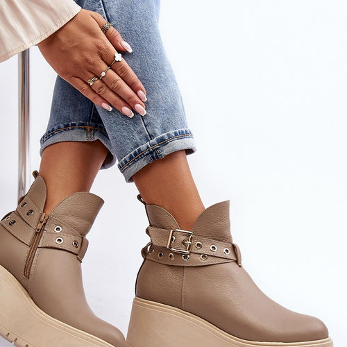 Women's boots made of natural leather. Set on an anchor and a massive platform. Fastened with a zipper. Upper decorated with straps with buckle. Inside insulated with shoe blanket. Rounded toes. Soft insole will provide comfort during use. fabric natural leather warmers shoe cover Footbed shoe cover Upper height 13 cm Heel height 7 cm Size Insole lenght 36 23.5...