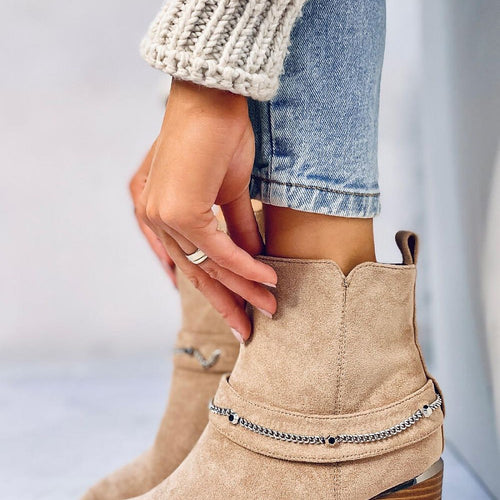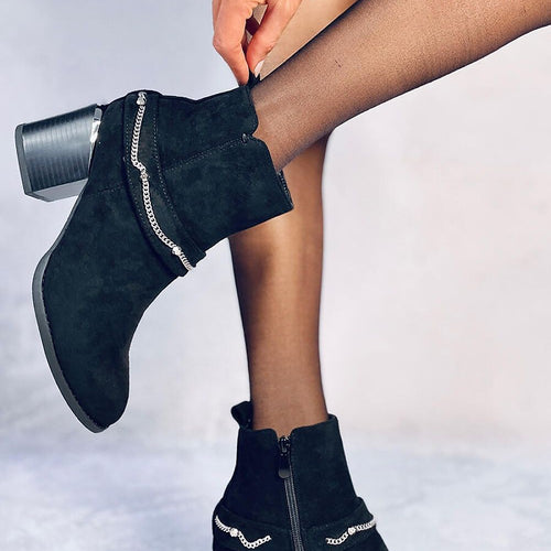 Women's suede boots. In these shoes with a subtle silver chain you will attract the eyes.... Model on a stable heel with a height of 7 cm is sure to delight admirers of comfort : ) Their undoubted advantage is the practical zipper closure on the side of the upper. They are made of eco-suede, and the interior is lined...