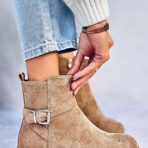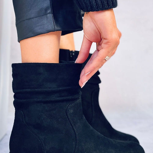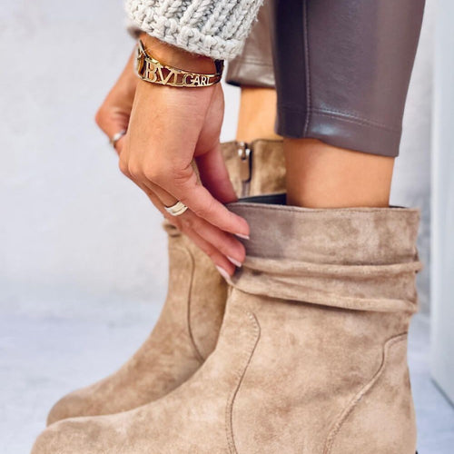 Women's suede boots on a flat sole. The unique charm of this model lies in its simple and classic cut with a fashionably creased upper. Convenient zipper closure on the side of the upper is another argument in favor of them : ) They are made of eco-suede, and the interior is lined with soft fur. fabric ecological suede warmers...
