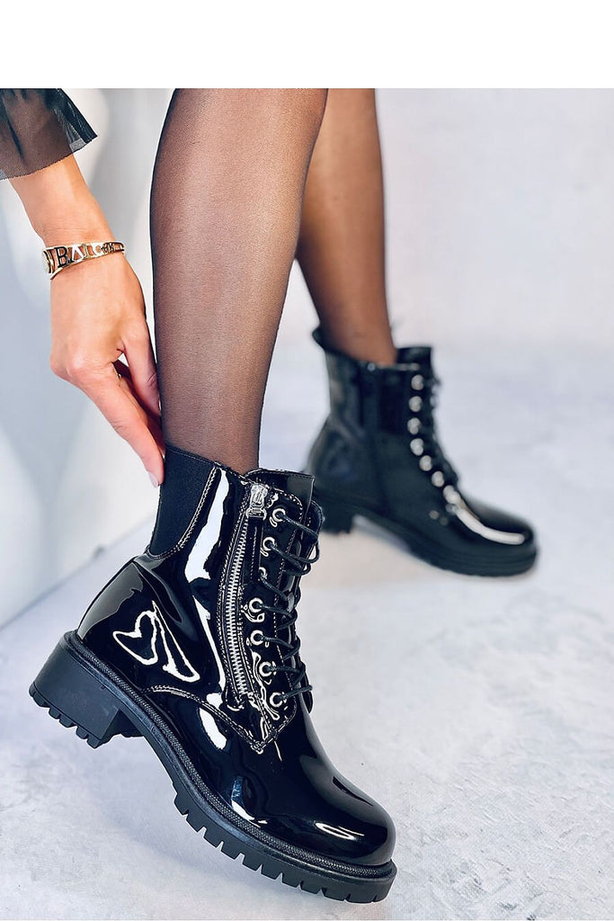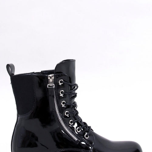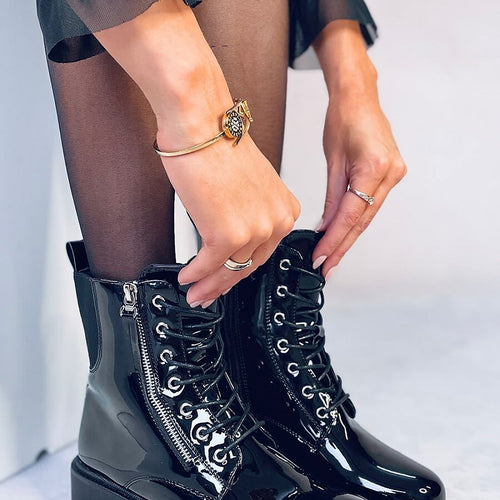 Lacquered women's boots - baggers on a protector. The practical zipper closure on the side of the upper ensures comfortable putting on, and thanks to the classic lacing, the boots can be perfectly adjusted to the foot. The lacquered finish gives them extravagance. The interior of the shoes is lined with soft fur. Outer material - lacquered ecological leather. fabric...