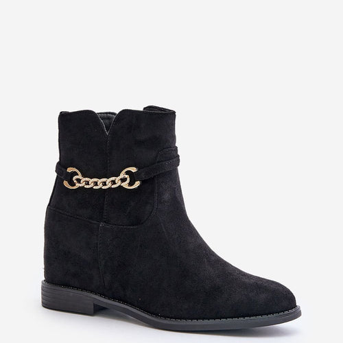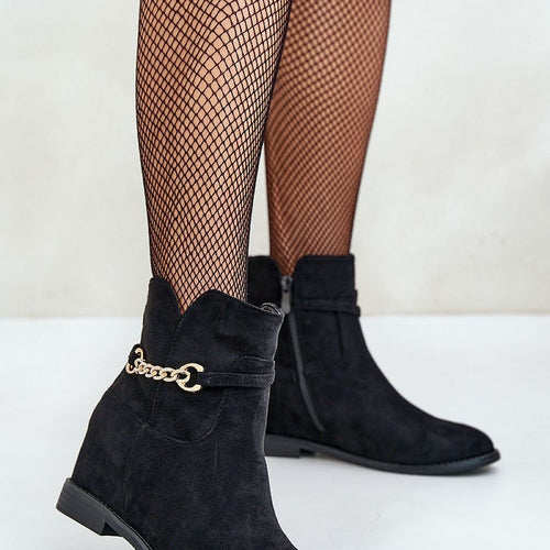 Women's ankle boots made of eco suede. Set on a flat heel and hidden platform. Rounded toes. Fastened with a zipper. An additional advantage of this model is a thin strap with a gold, short chain. fabric imitation leather suede warmers fabric Footbed artificial leather Upper height 12 cm Heel height 7.5 cm Size Insole lenght 36 23.5 cm 37...