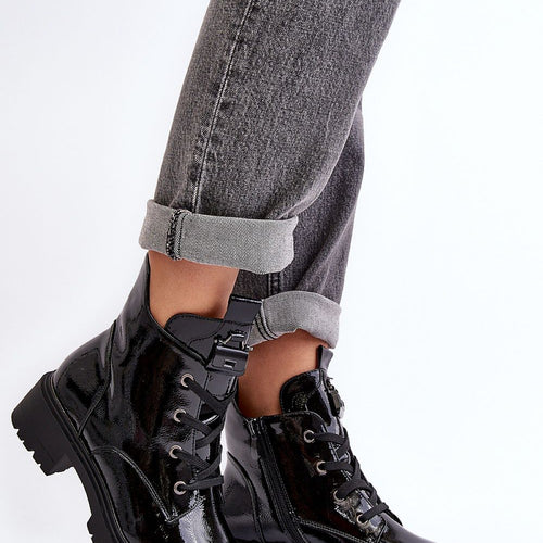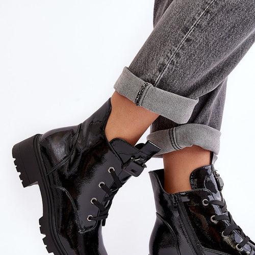 Elegant lacquered ankle boots, perfect for cooler days. Fastened with a comfortable zipper, which makes them easy to put on and take off. The interior is lined with shoe fleece, providing warmth and comfort. At the back of the boots, there is a gold decoration, adding a unique character and elegance to them. These boots are a perfect choice for...