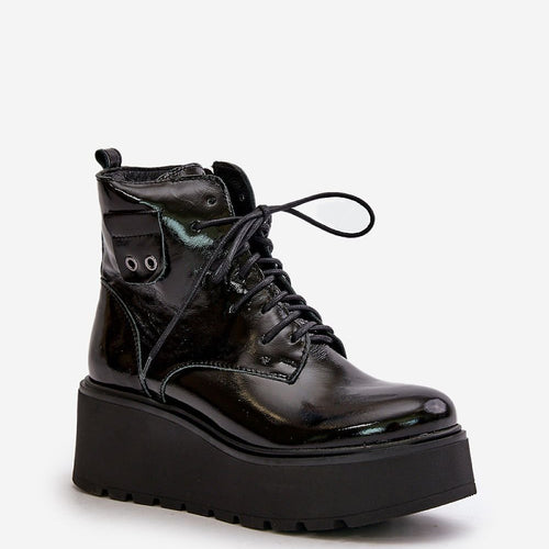 Women's boots made of natural leather are a stylish proposition for colder days. Set on a massive platform with a wedge heel, they provide comfort and stability. The zip located on the side of the shaft makes them easy to put on, while the stiffened heel adds durability and support to the shoes. The interior lined with felt guarantees warmth,...