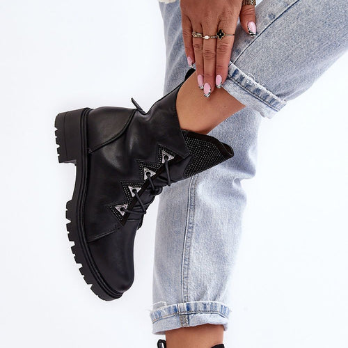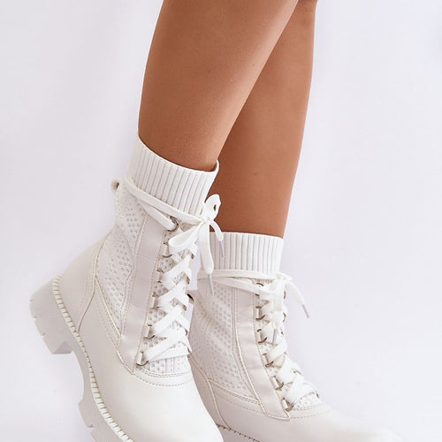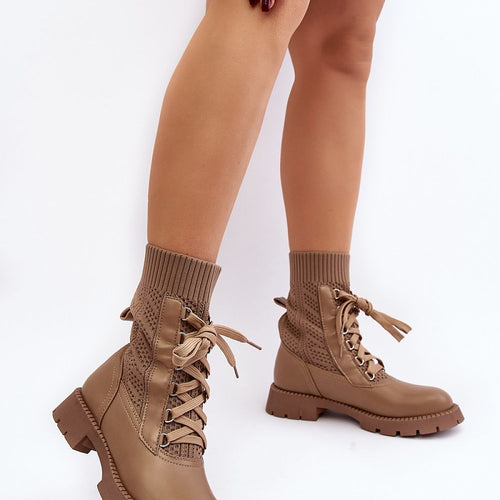 Fashionable women's boots were made from a combination of eco leather AND textile material. The model slips on and additionally has lacing. Set on a platform and a flat heel. Soft, eco leather insole will provide comfort during use. Rounded toe box. Ankle-length upper. You should definitely have them! fabric ~skóra ekologiczna plus tkanina Footbed artificial leather Upper height 21...