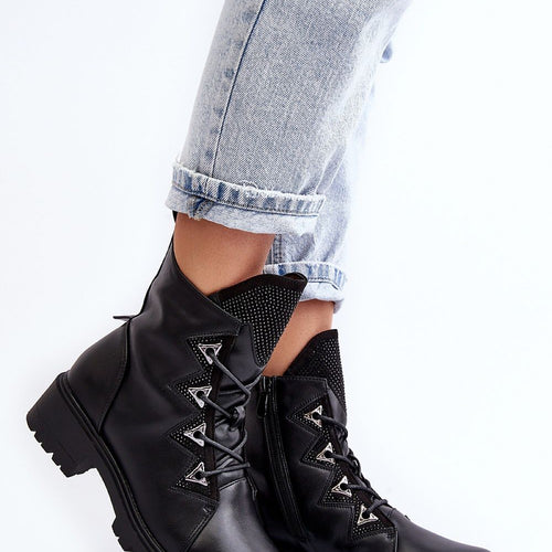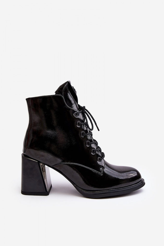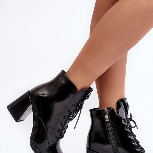 Women's boots set on a heel with a mirrored element. Made of eco leather. Zippered and laced. Ankle length upper. A small ornament on the tongue. Rounded toes. The inside is insulated with shoe blanket. You should definitely have them! fabric artificial leather warmers shoe cover Footbed shoe cover Upper height 10 cm Heel height 7.5 cm Size Insole lenght...