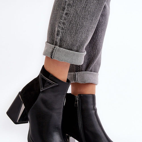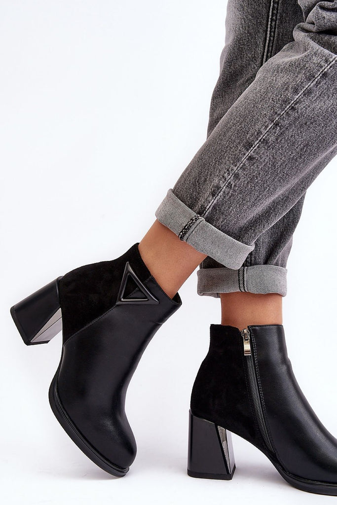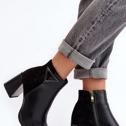 Women's boots made of a combination of eco leather and eco suede. Set on a heel in the form of a post. Rounded toe. Ankle length upper. Zippered closure. The inside of the shoes is insulated with soft shoe blanket. Perfect for autumn styling! fabric ~skóra ekologiczna plus skóra ekologiczna zamszowa warmers shoe cover Footbed shoe cover Upper height 10.5...