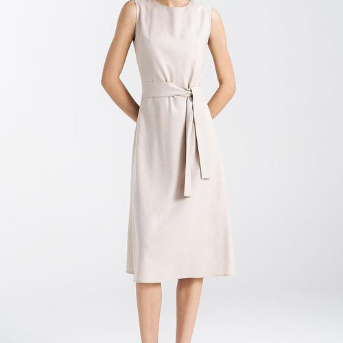 A regular fit dress made of a blend of viscose, linen, and cotton, perfectly combines elegance with comfort. It features a round neckline and is sleeveless, adding lightness and a summery feel. The hidden zip closure at the back ensures a neat finish and easy wear. The midi length makes the dress versatile and suitable for various occasions. It comes...