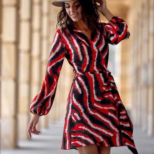 The dress is made of a pleasant, patterned fabric that looks extremely feminine and tasteful. The wrap-style dress has a waist tie that perfectly accentuates every body type. The shorter mini length emphasizes the legs and provides freedom of movement. Long sleeves with delicate ruching on the shoulders are finished with an elastic band that creates a puffy effect. The...